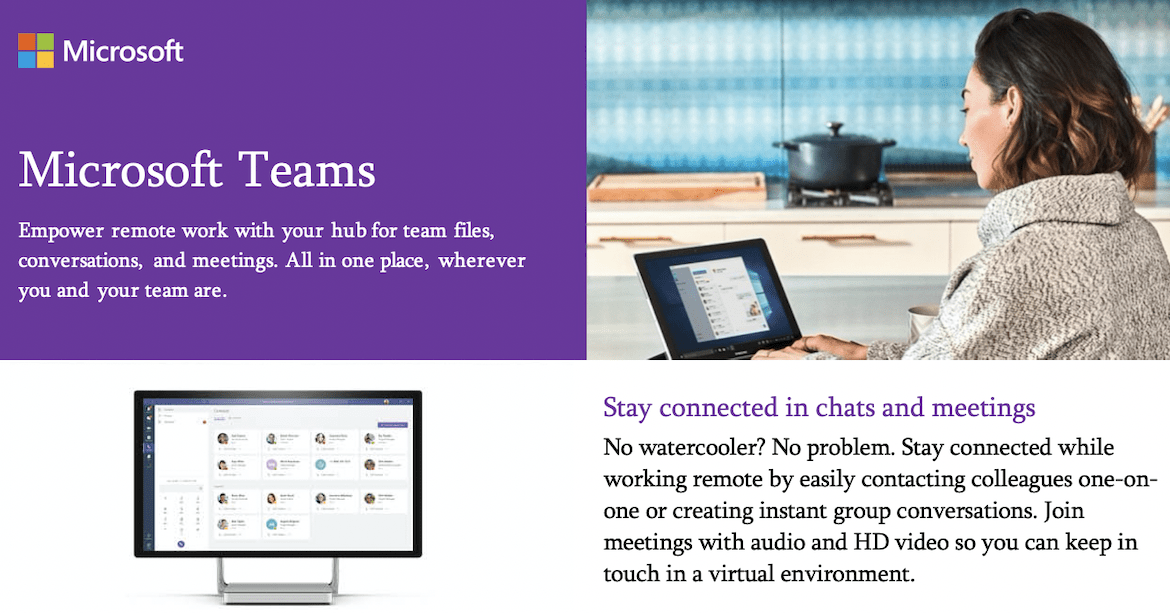 Enforce social distancing and remain working from home while also keeping your business running. No matter where you and your employees work, Microsoft Teams can be your hub for all files, conversations, and meetings. See what this one-stop-shop can do for your connection, collaboration, and productivity.
