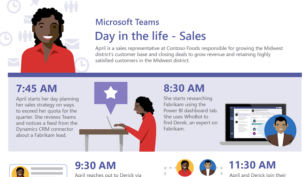 April, a sales rep, is looking to grow her company’s Midwest customer base. She starts her day finding a lead in Microsoft Teams and then uses Dynamics and Power BI to dig out connections that turn that lead into an opportunity. By 5pm, she has a new resource to amp up more sales opportunities in the region.